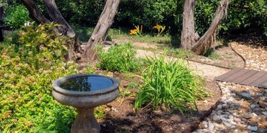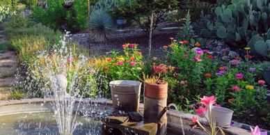 A Crystal Falls developer carved a 3-acre building site from a tall hillside adjacent to a swimming pool and putting green, leaving a challenging rocky slope for the homeowner to tackle. A retaining wall provides initial runoff protection, while several horizontal paths zig-zag the hillside. The upper edge of each path is banked with soil and planted, capturing rain in true Permaculture style. Lush with trees and vibrant plantings—most of which are native—the garden comes alive with texture and color, centered around a creative water feature. Along the hillside, cascades of flowers not only delight the eye but also spark the inspiration behind many of her paintings.